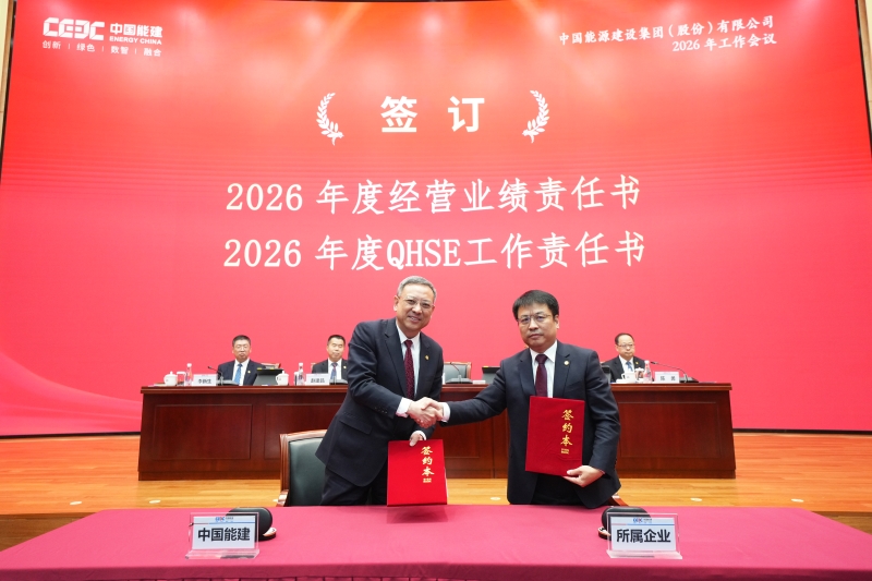 2026年工作會暨二屆一次職代會。中國能建黨委書記、董事長倪真與所屬企業簽訂2026年度經營業績責任書、QHSE工作責任書。