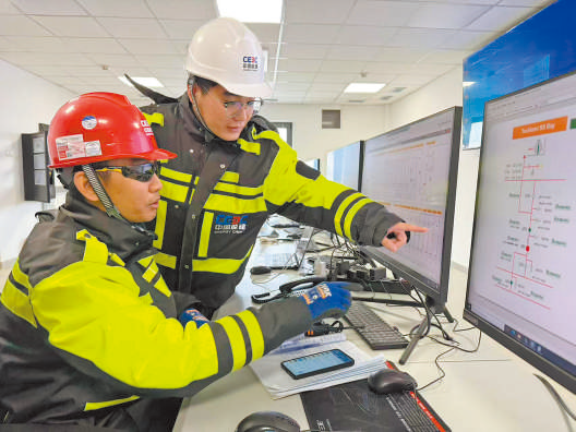 在烏茲別克斯坦塔什干光儲項目儲能站主控制室內(nèi),中方工程師正指導(dǎo)外籍員工檢查線路側(cè)運行數(shù)據(jù)
